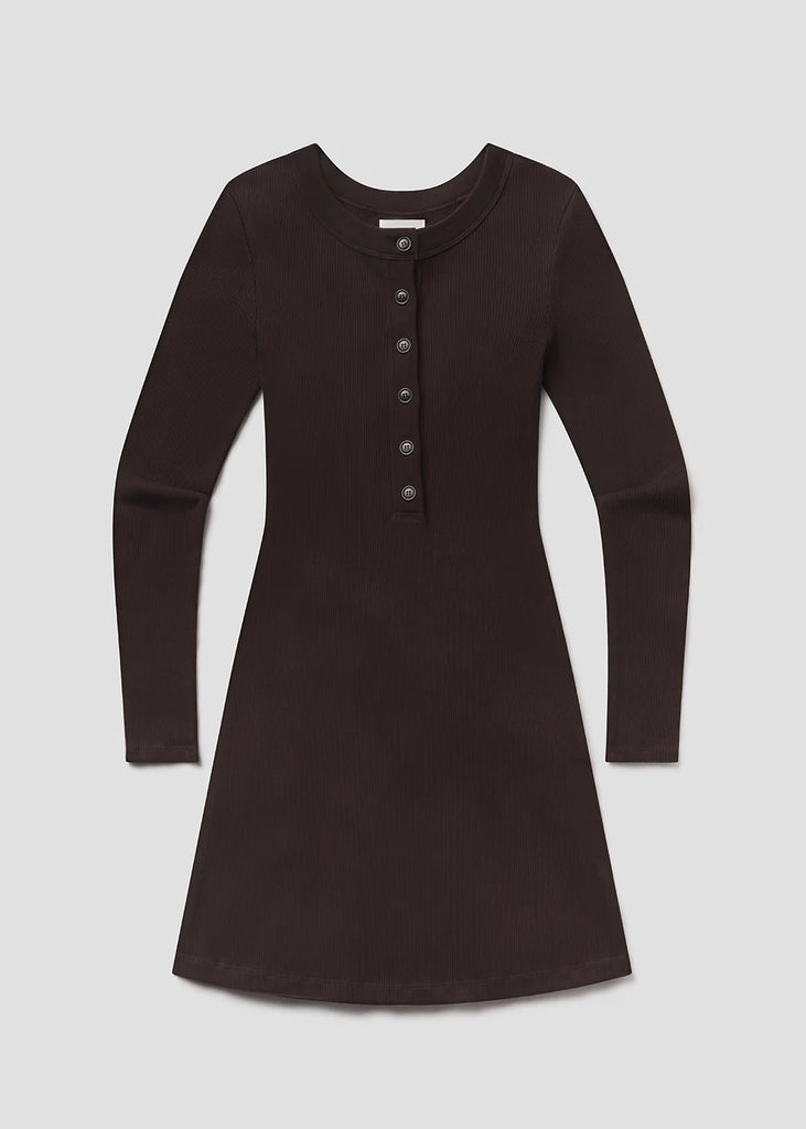A refined take on the everyday mini, the Nali Dress is cut from ultra-soft, supportive rib crafted from regenerative cotton. The long sleeve silhouette flatters with subtle structure and stretch, while the rich Chocolate hue adds depth and warmth. Effortless on its own or layered under outerwear for cooler days.