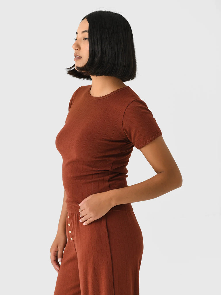 Cut in our nostalgic Pointelle Cotton, The Pointelle Slim Fit Tee features a classic crew neckline and fitted short sleeves with our signature pinhole stripes, dainty eyelets, and scalloped edging.