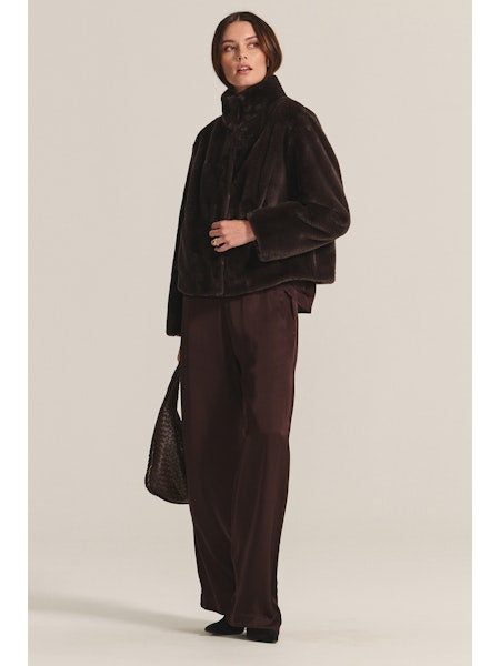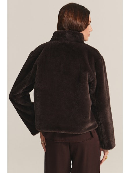 This jacket combines the luxury of soft faux fur with practical design elements, including a jumbo snap button front, mock neck collar, and slash pockets. The slightly cropped, lined construction ensures both warmth and a chic, cozy fit.